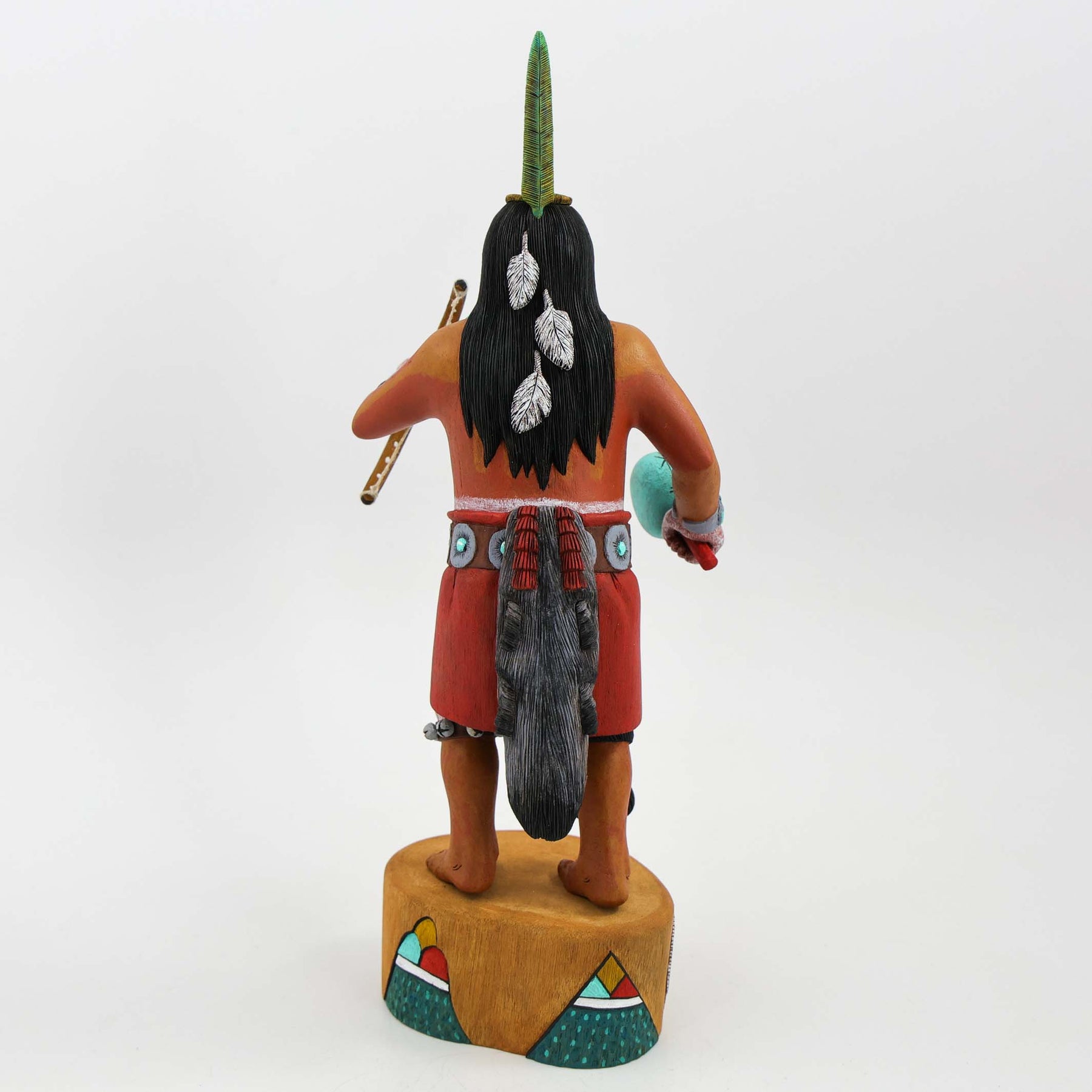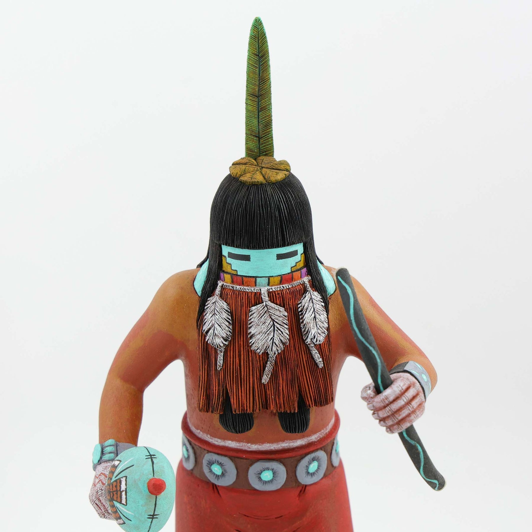 Hopi carver Andrew L. Sahmie Sr. (Hopi/Tewa) created this detailed new-style carving of the Navajo Longhair Kachina, known in Hopi as Tasap Angak’china. The figure is shown with flowing hair, symbolic of  rain, and holds both a bow and rattle. Around the waist is a Navajo concho belt, and a tall green feather rises from the head, a traditional marker of the Longhair’s role as a prayer bearer. The base is painted with the Four Sacred Colors of Corn along with imagery of the San Francisco Peaks and other sacred mountains. The “Navajo Longhair Kachina” is a Hopi carving of a katsina figure that honors the Navajo-adapted version of the Hopi Longhair. The main difference is cultural attribution and some stylistic elements, but both represent prayers for rain, crops, and balance.