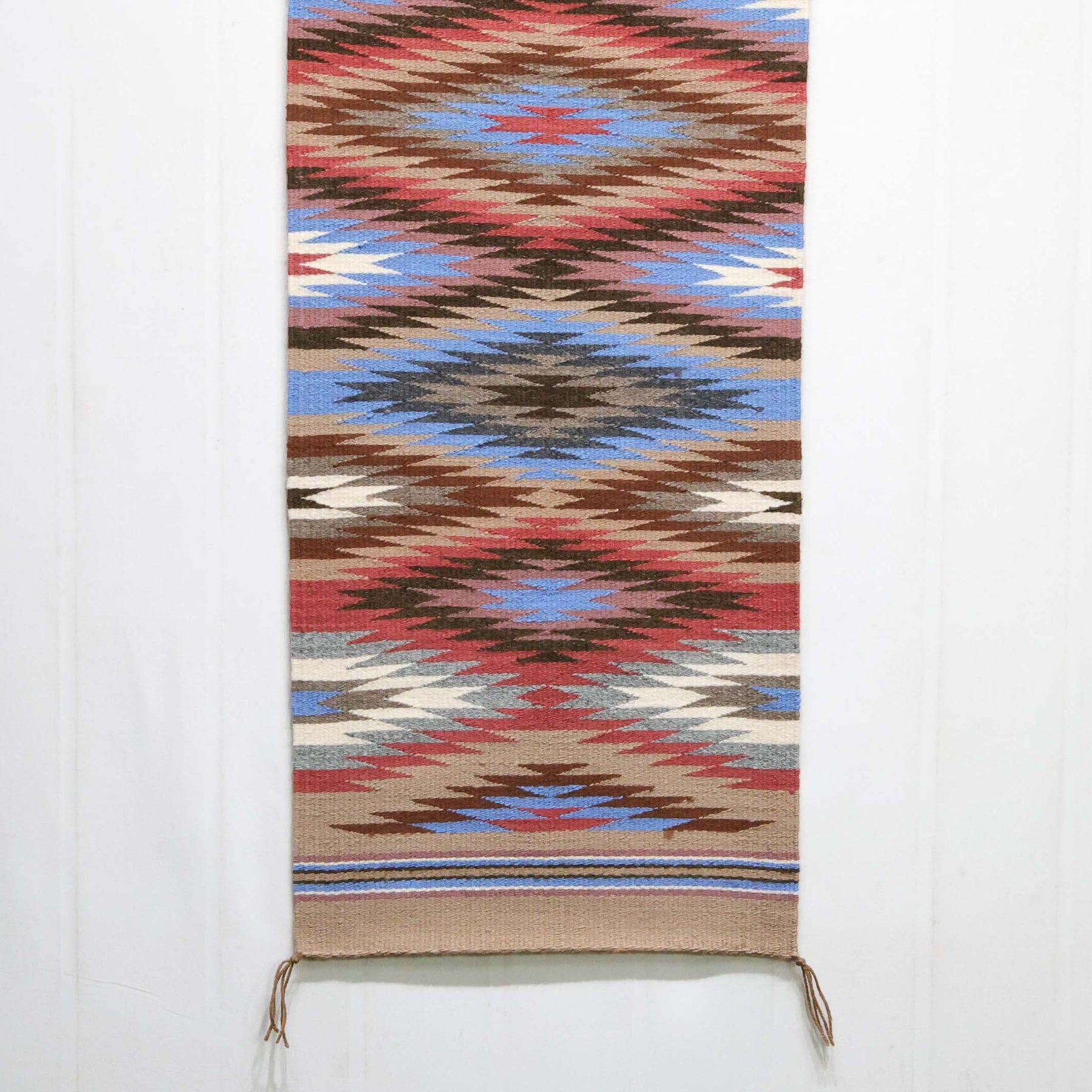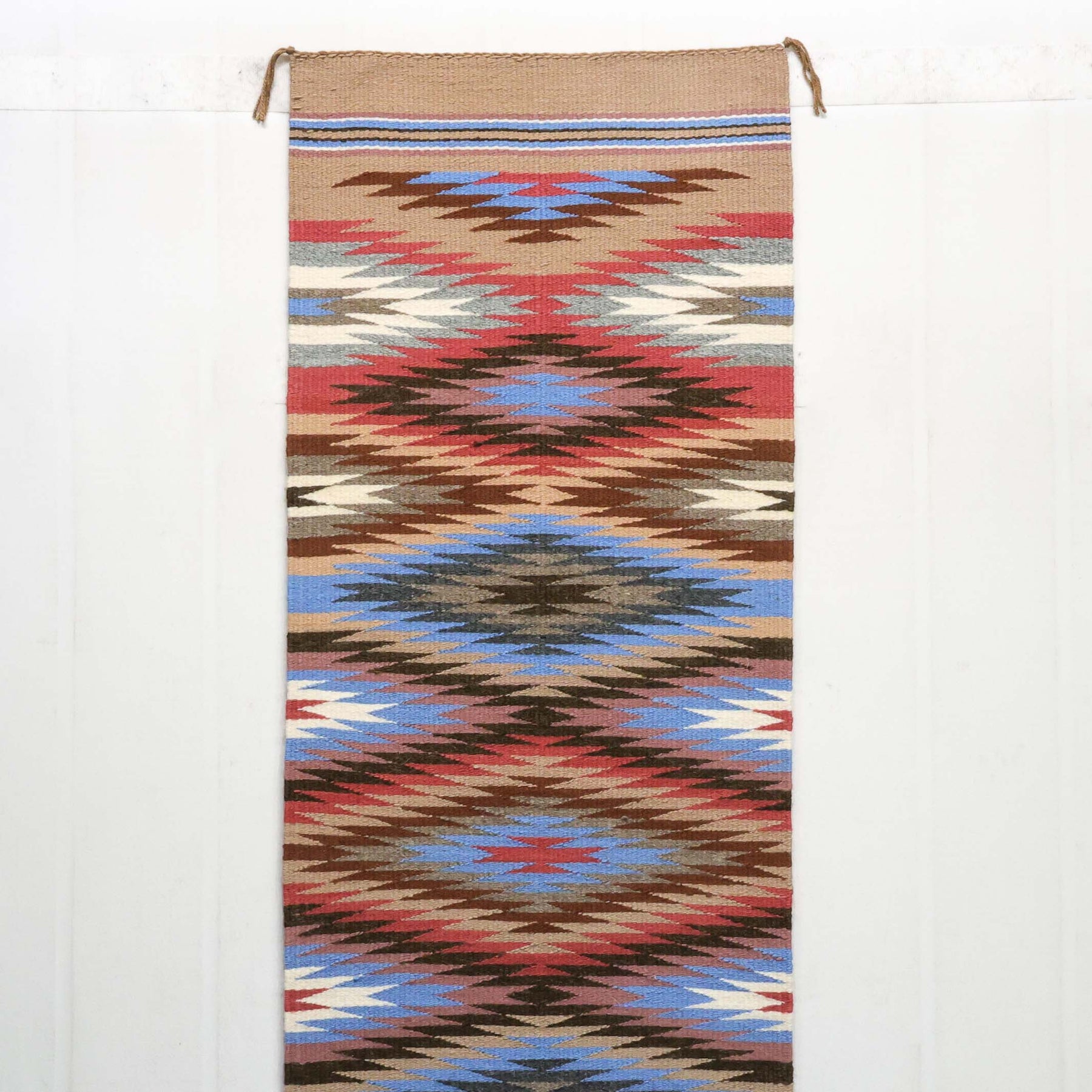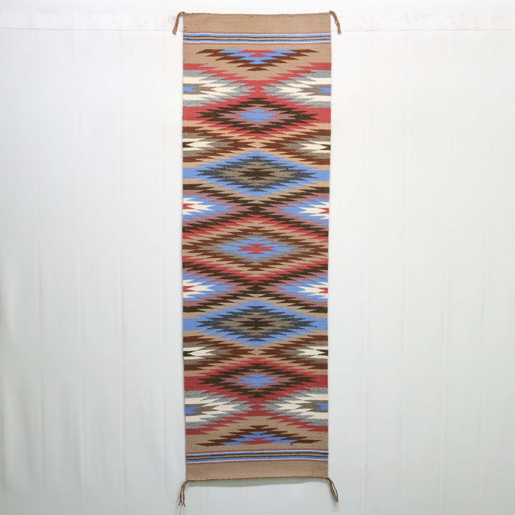 Handwoven Navajo Chinle Runner Weaving Featuring a Serrated Diamond Design with a Light Brown Background and Pink and Blue Accents.
