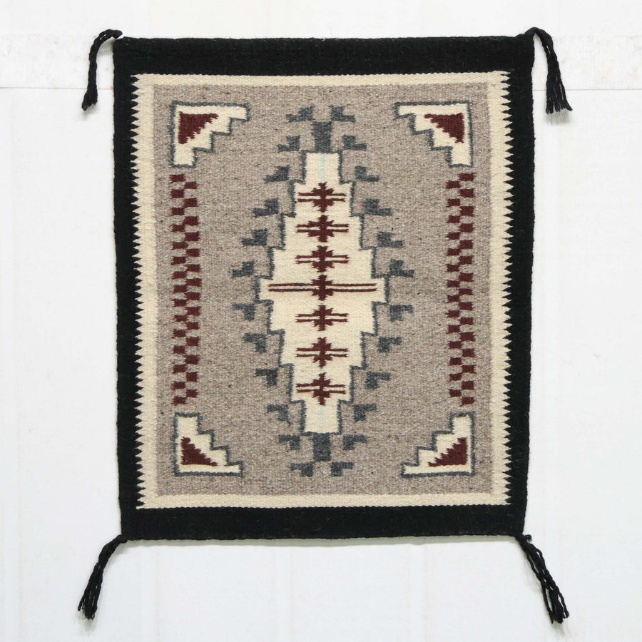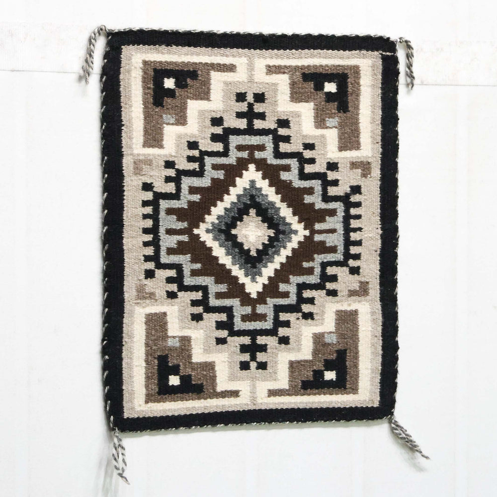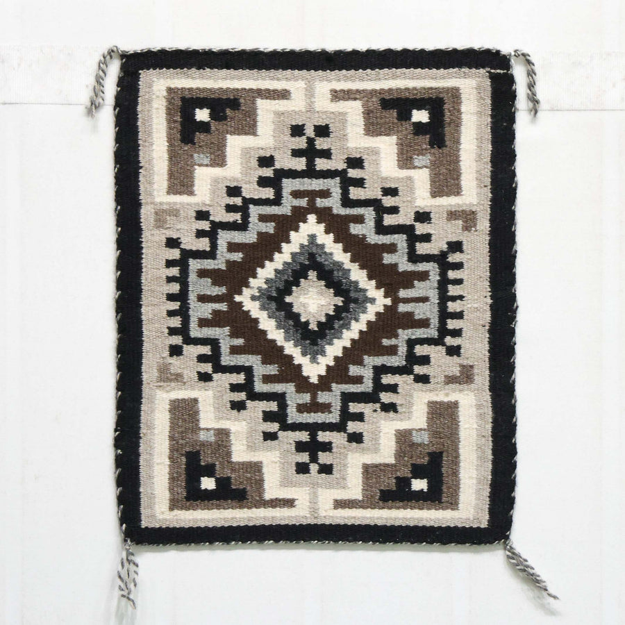 Two Grey Hills is located on the east side of the Chuska Mountains in the New Mexico portion of the Navajo reservation. The weavers in the Two Grey Hills area prefer to use natural un-dyed homespun native wool instead of commercial yarns. The colors in a classic Two Grey Hills design will consist of black, gray, beige, brown and cream. Each weaver will develop her unique yarn colors by blending natural wool colors together by a process called “carding”. To achieve a solid black color the weavers will over-dye the dark brown wool with a black dye.