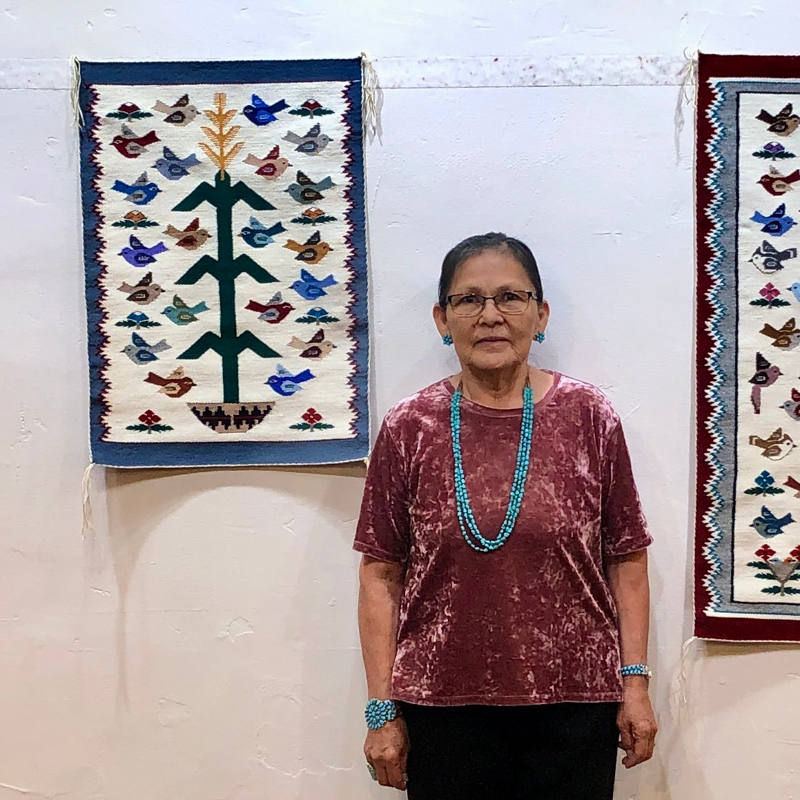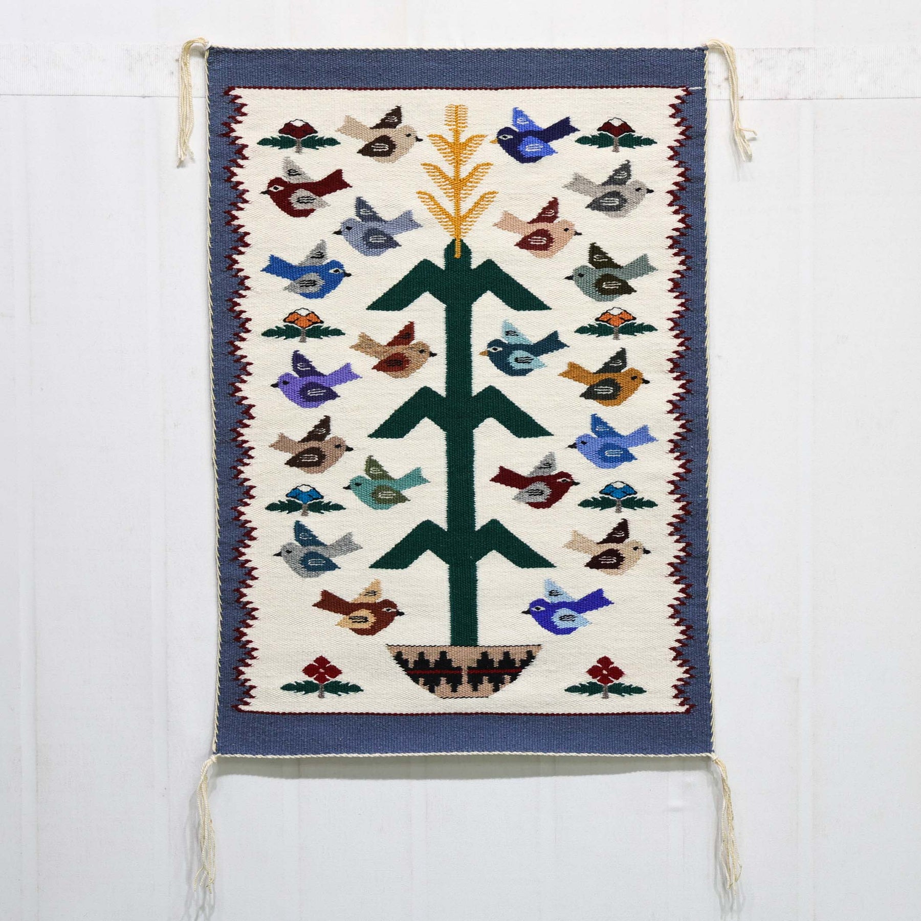 Handwoven Navajo Bird Pictorial (Tree of Life) Weaving with a Cornstalk Emerging from a Ceremonial Basket surrounded by Colorful Birds on a White Background.