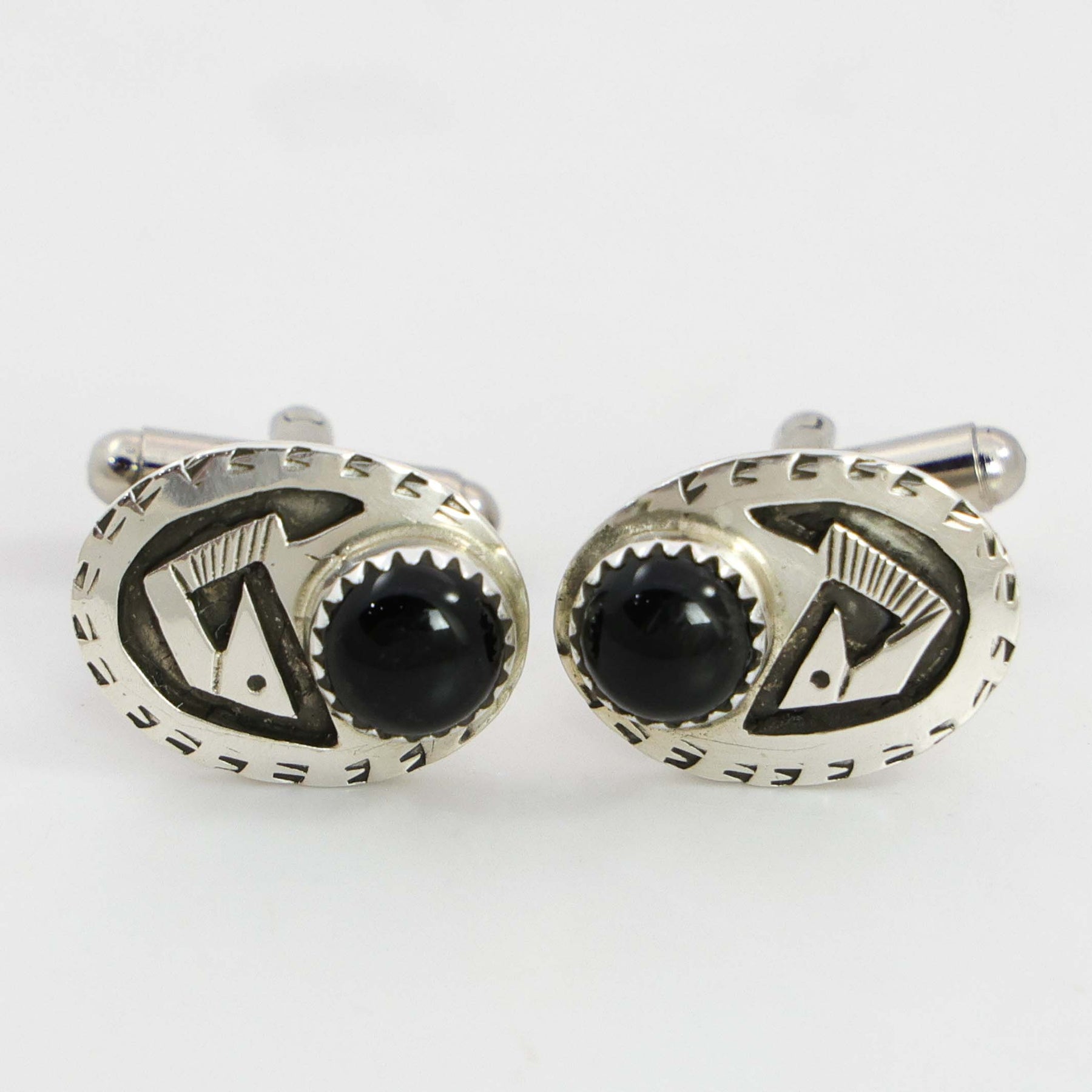 Sterling Silver Cuff Links with Overlaid Designs and set with Onyx.