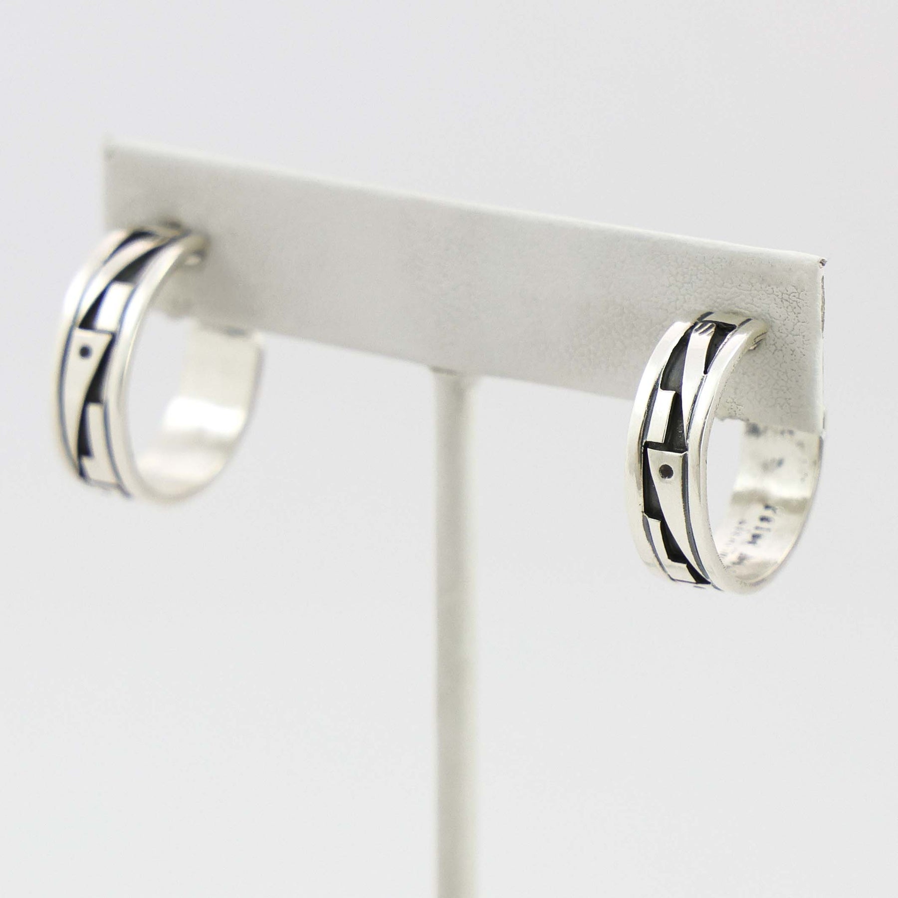 Sterling Silver Post Hoop Earrings with Overlaid Designs.